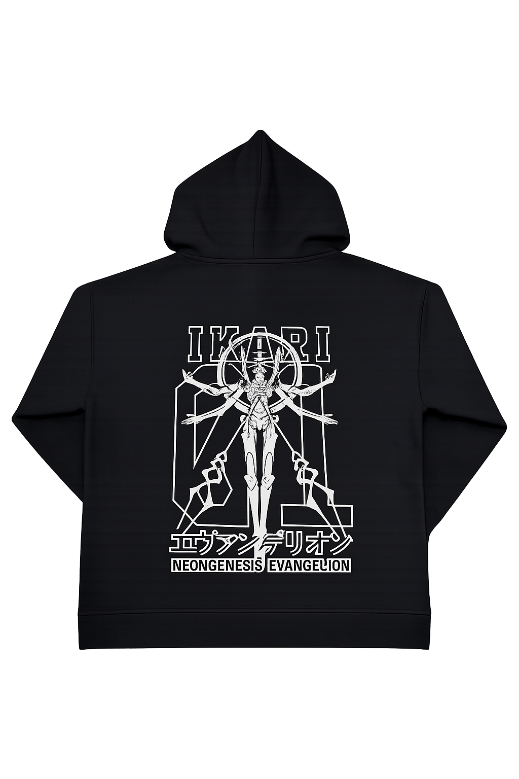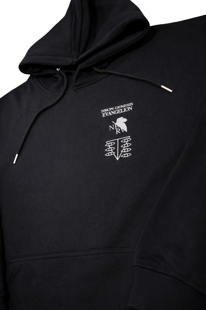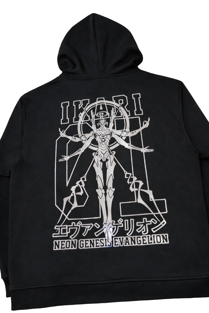 Design: Minimal chest emblem with a bold Evangelion-inspired back illustration